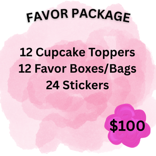 Package comes as listed 12 Cupcake Toppers, 12 Favor Boxes or Bags, 24 Stickers.